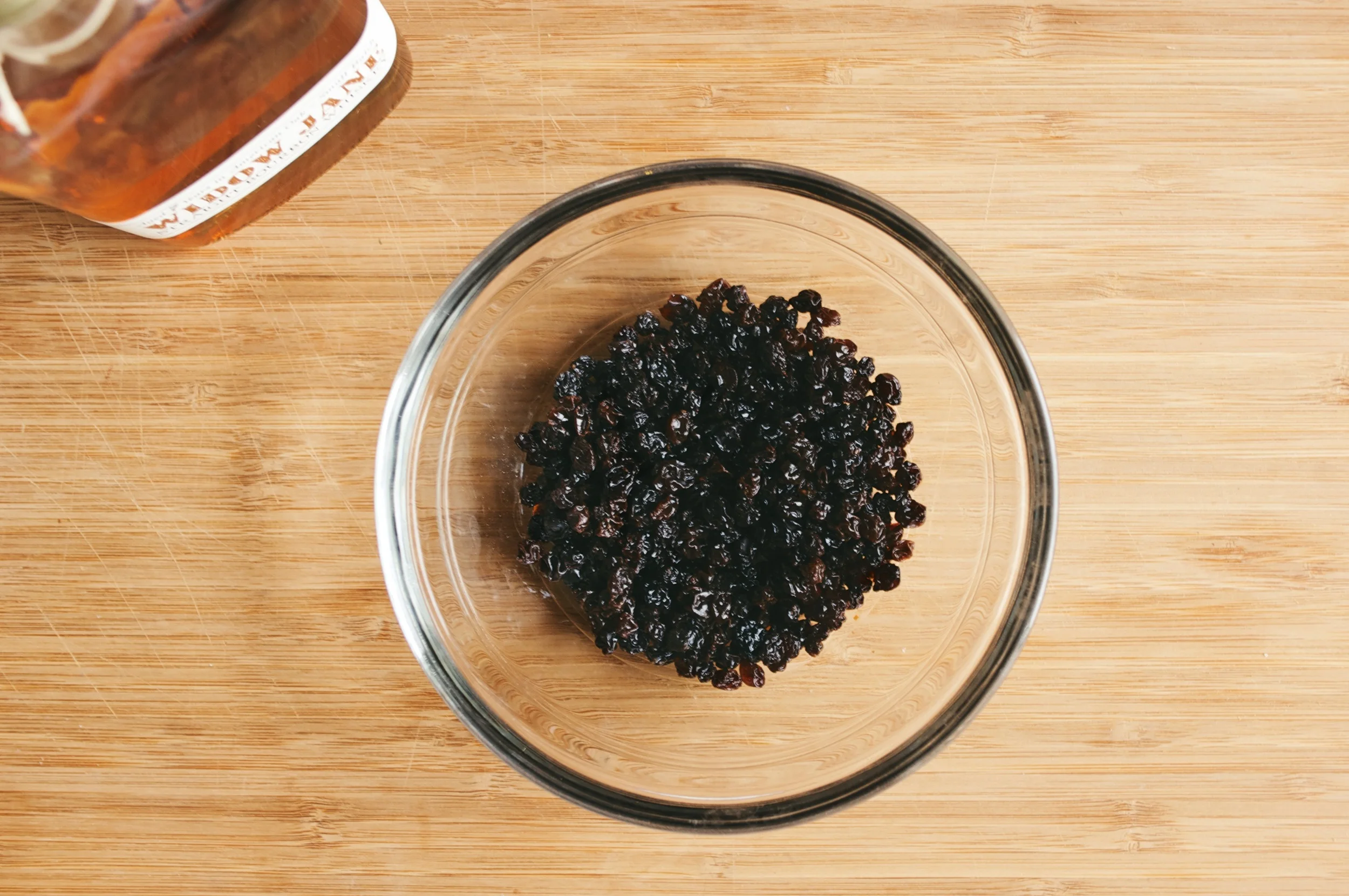 1. place dried currant in a small bowl with the whiskey, soak for at least an hour, until currants are plump and most of the liquid is gone