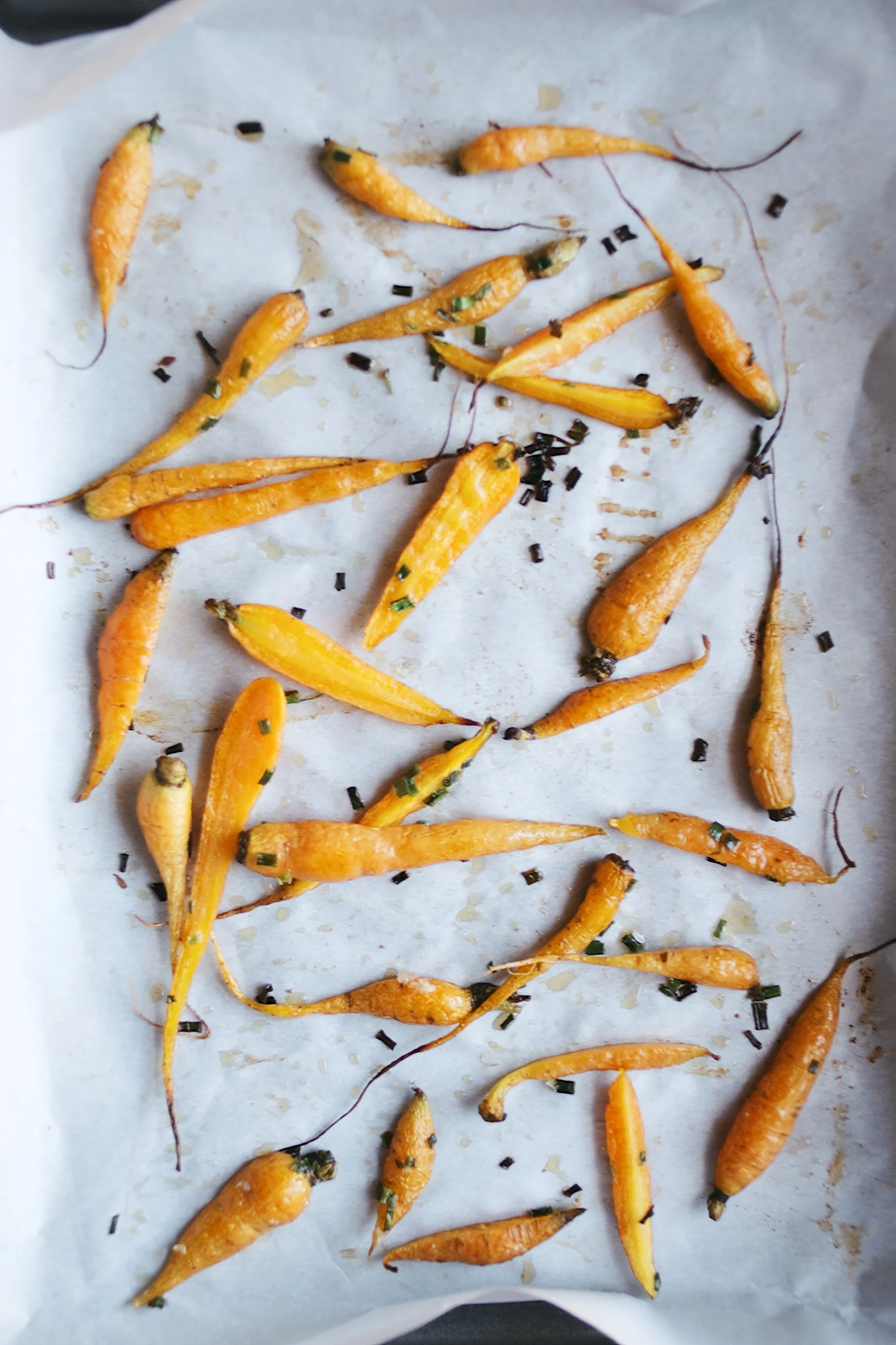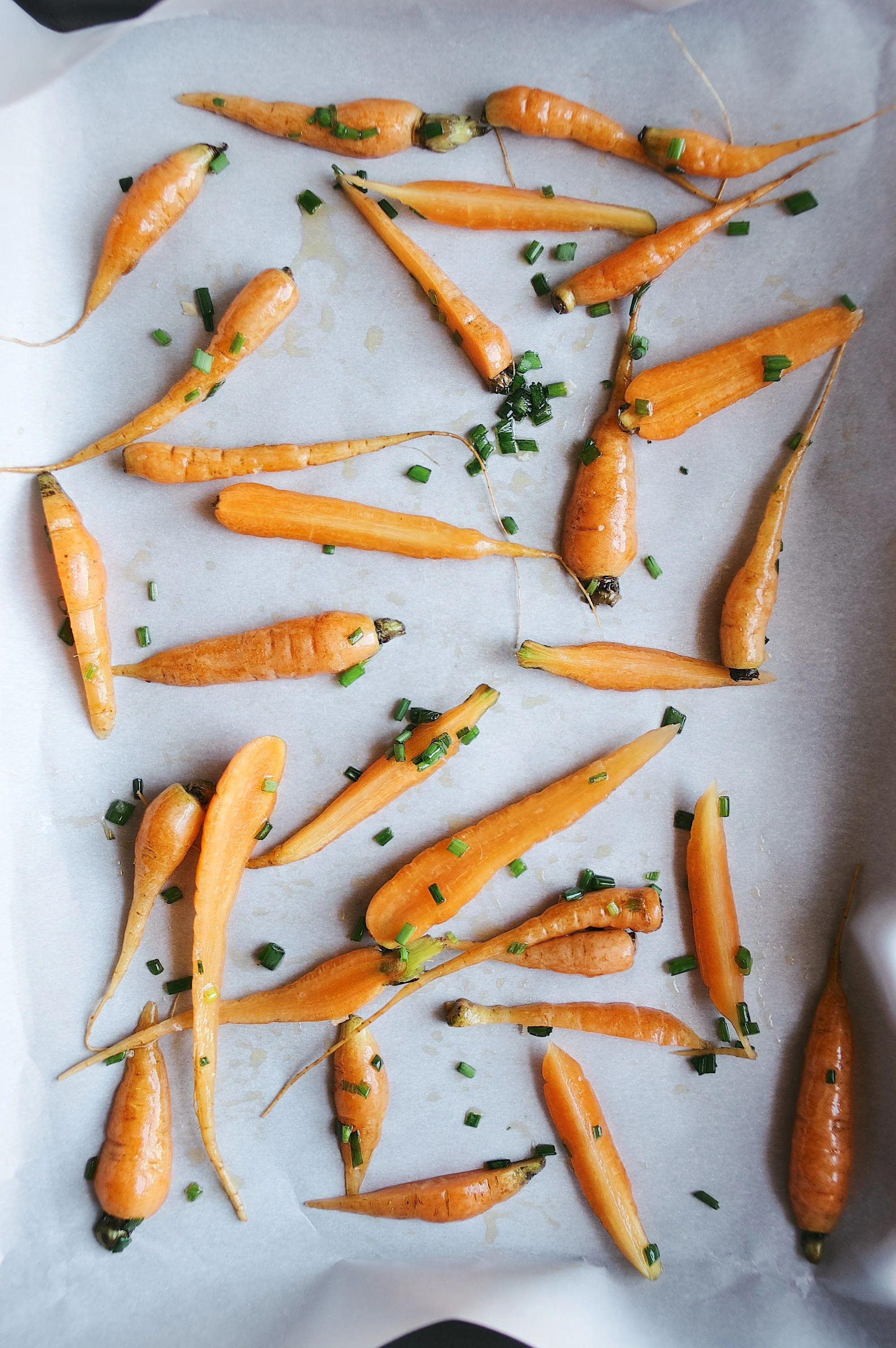• in a mixing bowl, toss carrots with sesame oil, mirin, chives, cilantro and salt.  spread out onto baking sheet and roast until lightly browned, 12-15 minutes