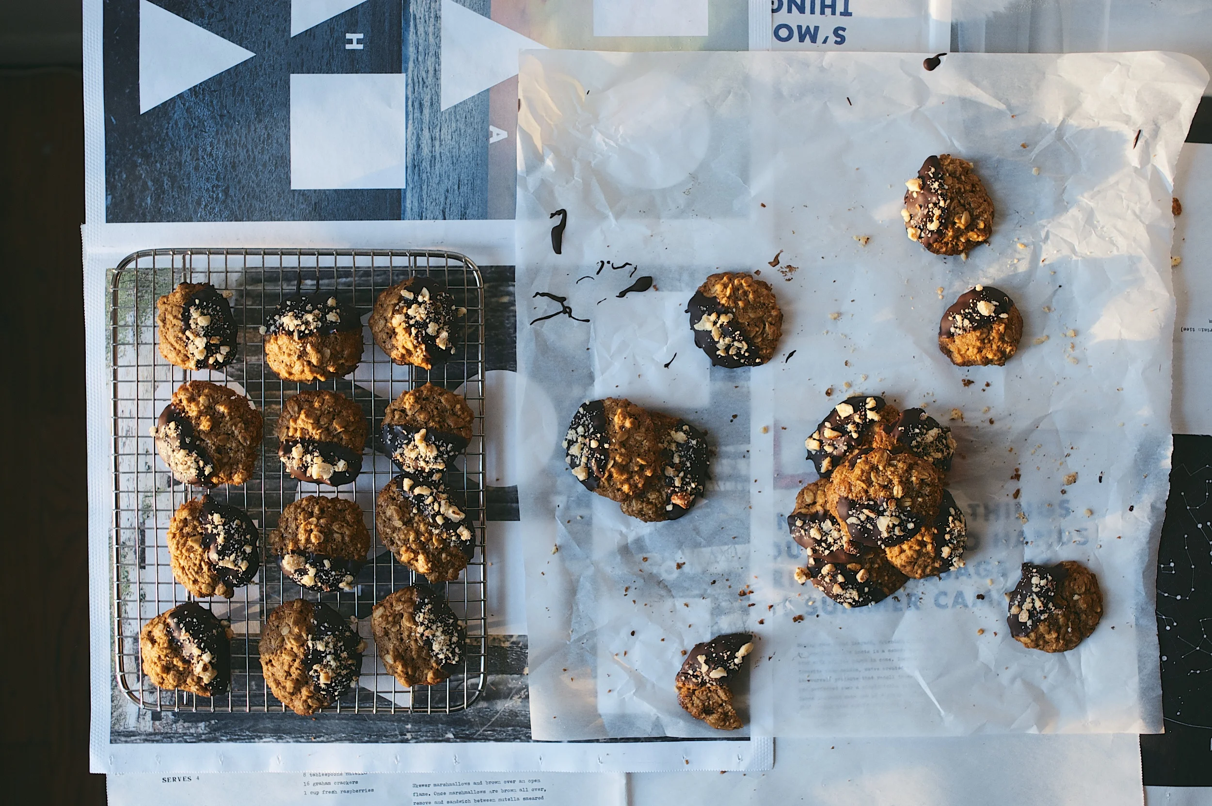 speaking of life's goods: cookies! i was totally inspired by One Part Plant's Jessica Murnane's cute new e-book, A Year Of Cookies! which has really great recipes from Baked, Laura Wright of The First Mess, Julie Lee of Julie's Kitchen and many others. so, i set out to make an oatmeal cookie of my dreams. i'm not a big fan of the usual chewy oatmeal cookie studded with raisins or perhaps other dried fruit. to me, cookies are best when sweet and crunchy, and all that remains after your first bite is a lick of salt on your lips. also, cookies of my dreams regularly contain nuts, it's a rule. i wanted to incorporate something toasted and nutty and thought the hazelnut meal would suite that need perfectly. and generally when i think of hazelnuts in a sweet sense, i think chocolate. so, naturally, chocolate dunked cookies were in order this go round. hope you enjoy : )