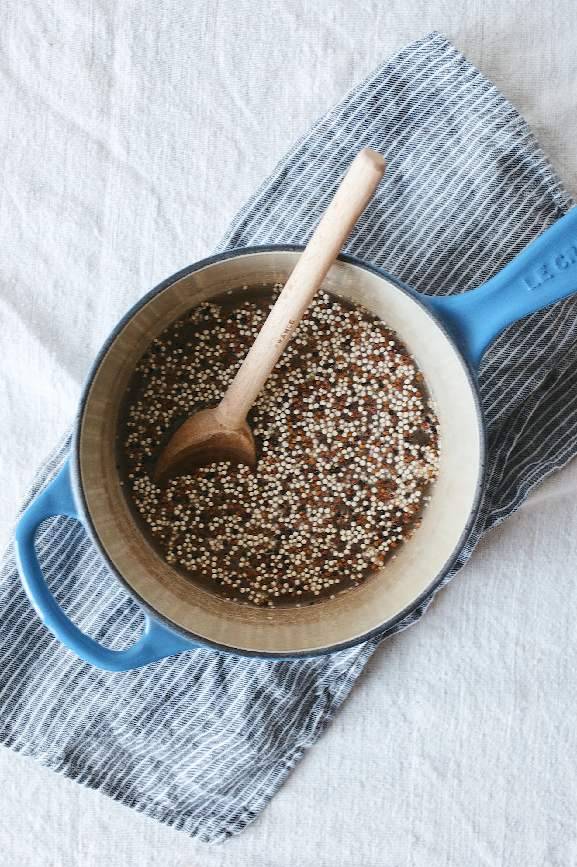 - rinse the quinoa and place in saucepan with 1 3/4 cups of water. bring to boil, stir, and cover the pot; turn heat to low and cook 10-15 minutes. remove from heat and let it sit for 5 minutes, then fluff with a fork. transfer to a large bowl