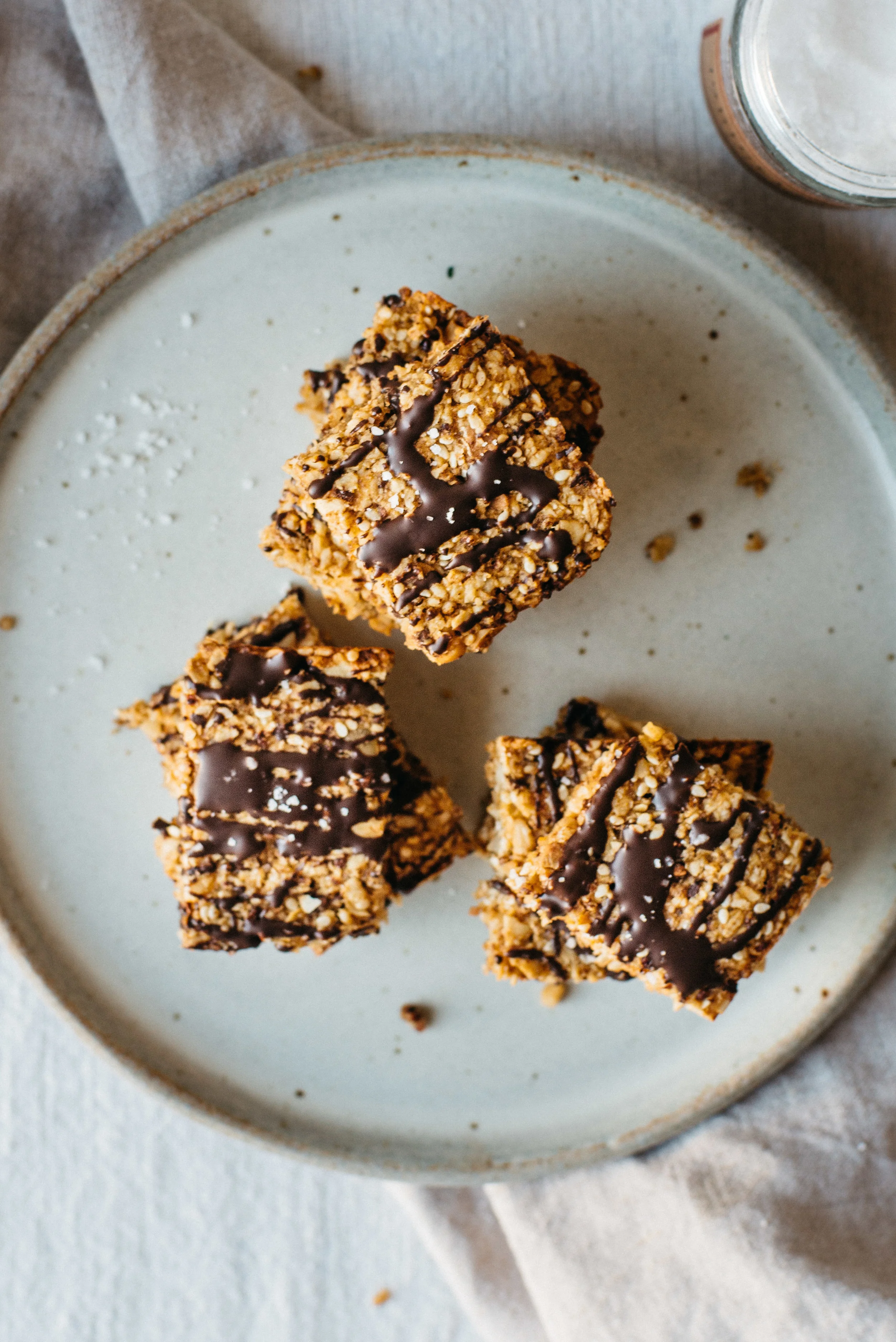 if you've hung around this space enough, you're probably aware that i love sprinkling flecks of salt on anything made in combination with chocolate.  which brings me to these butternut squash bars!  there are so many recipes out there that i've been meaning to make, then months (and sometime years) go by, and then i'm reminded of them and kicking myself for how much time has gone by.  case in point,  laura's banana bread granola bars with chocolate drizzles! well, the baking stars aligned last week and i finally made them with a few seasonal changes.  i thought friendsgiving called for more of a pumpkin bread granola bar situation, and from there i loaded these babes up with some warm spices and added a few festive pumpkin seeds.  these butternut bars came together so delightfully, they're sweet enough to count for dessert, but hearty enough to enjoy in the morning as a sturdy breakfast.  they are totally a new favorite non-treat, treat!