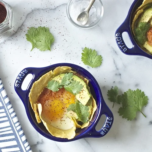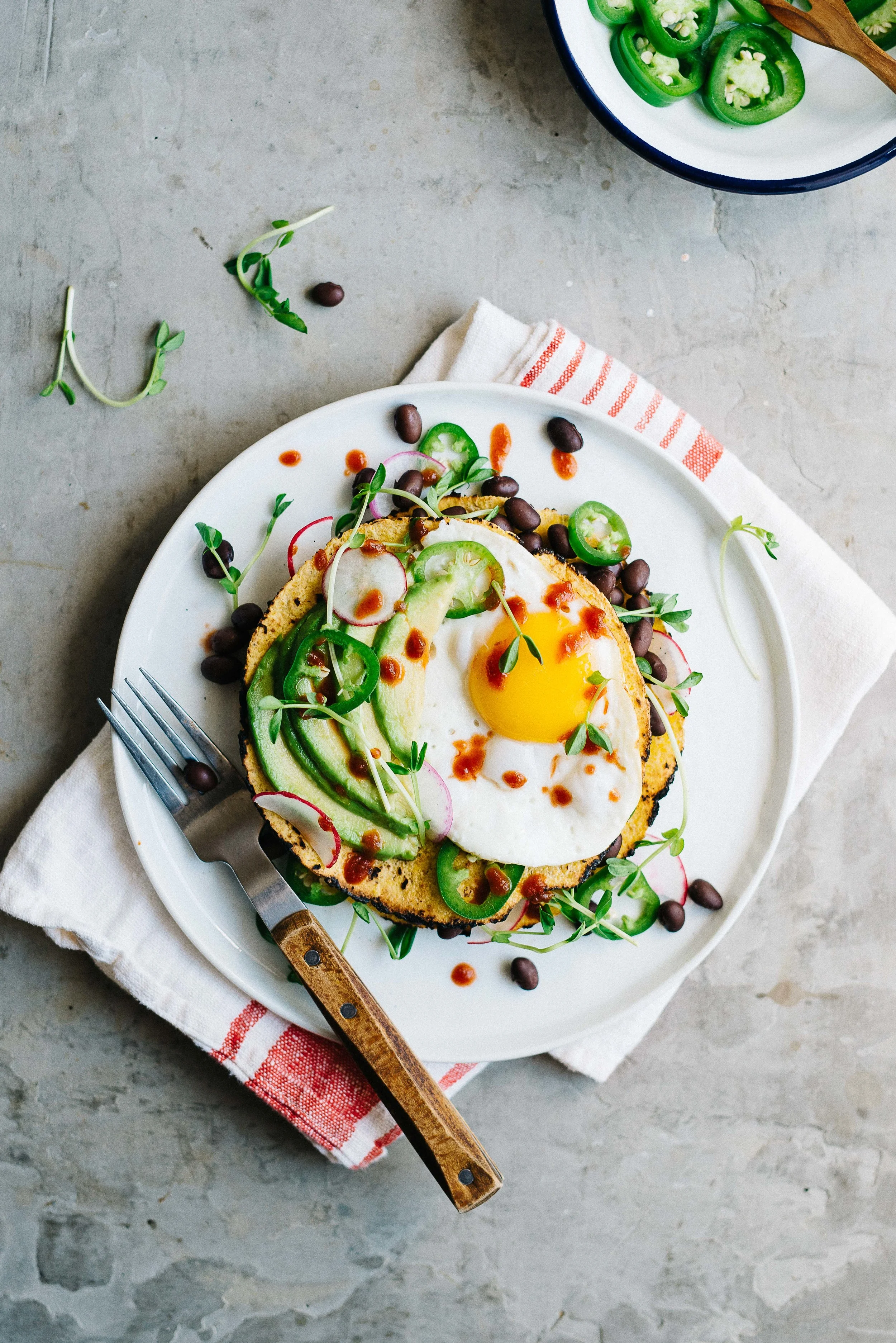 - top each tostada with 1 egg, a few slices of avocado, more jalapeños, radishes, and pea shoots. drizzle with hot sauce (optional), a sprinkle of salt, and a few grinds of pepper.