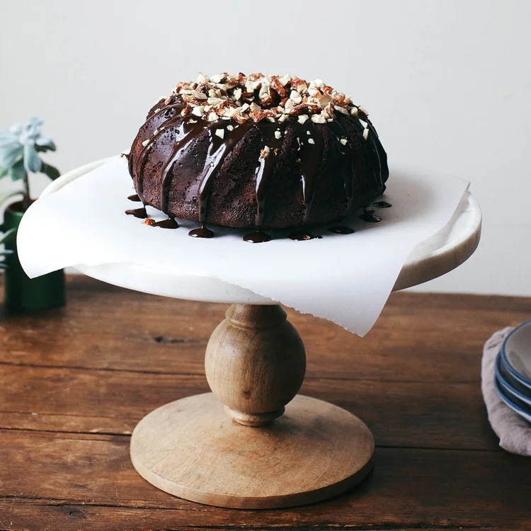 - preheat oven to 350°F and oil an 8-inch bundt pan, dust pan with cacao powder and set aside.