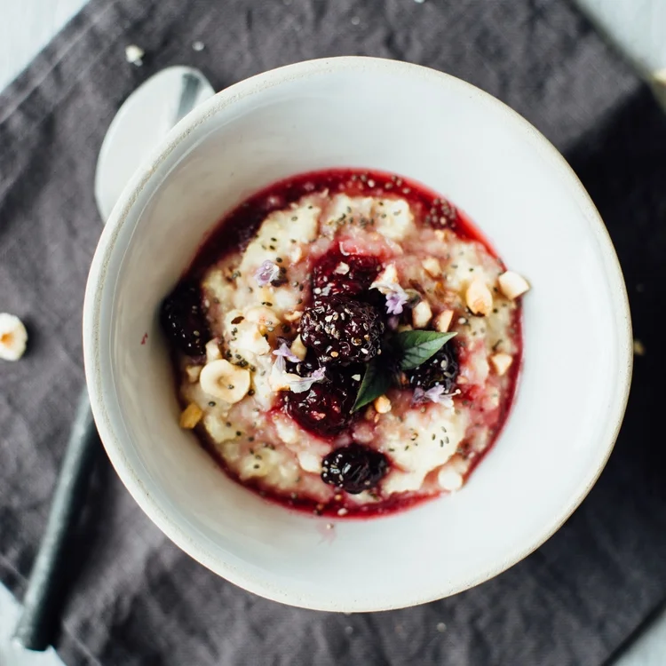 these breakfast oats are a reminder of my time spent in LA last summer with my brother, his fiancé, and my husband. we stayed in my brother's apartment in downtown near one of cafe gratitude's locations (aka my favorite restaurant on earth). every morning frank and i would head down there for some breakfast. i would either get the granola or their steel cut oats, and frank would try some funky thing that i would never go for (like this savory french toast with tempeh chorizo!). the oats became an instant favorite. they had a creamy yet al dente consistency, they were mixed with stewed peaches, and topped with a mildly sweet cashew cream. when i went back for another visit a couple months ago all i wanted was their oats and those stewed peaches! to my (somewhat) dismay, they were serving the oatmeal with seasonal pears instead of summer peaches. womp, womp.