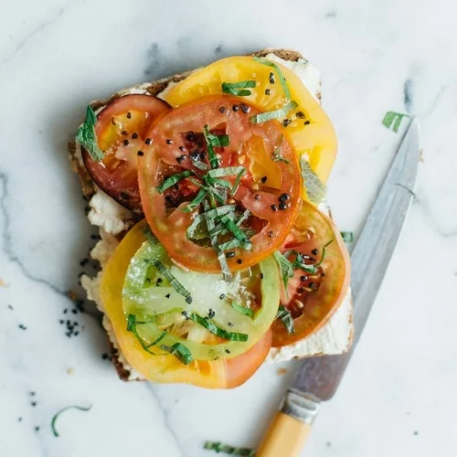 tomato toast w/ macadamia ricotta & shiso