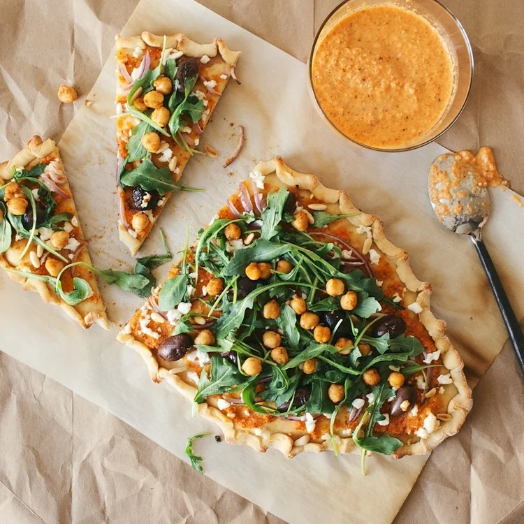 romesco pizza w/ spiced chickpeas & lemony arugula
