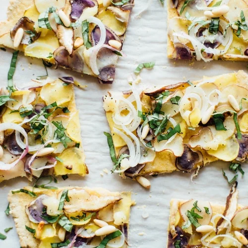chickpea flour flatbread w/ new potatoes & fresh basil