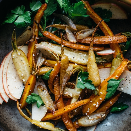 i always find that my meals mimic my mood which still honors winter, but is so very ready for the shift that the new season always brings with it. so around this time of year i find myself eating somewhere between heavy winter meals, sprinkled with some lighter spring fare. think: this creamy pasta situation, with this hearty seasonal salad. but once a week, no matter what season it is (expect the height of summer, maybe) i roast a huge tray of veggies for frank and i. in the fall months it's root veg with all the squash, and in the spring it's usually a lighter medley where i throw asparagus in in the last 10 minutes of roasting. but in the winter i roast this tray of veggies here.