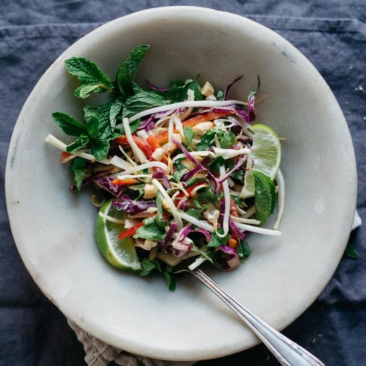 4. drizzle the dressing over the salad and toss to distribute the dressing.  garnish the top of the salad with the remaining toasted coconut.