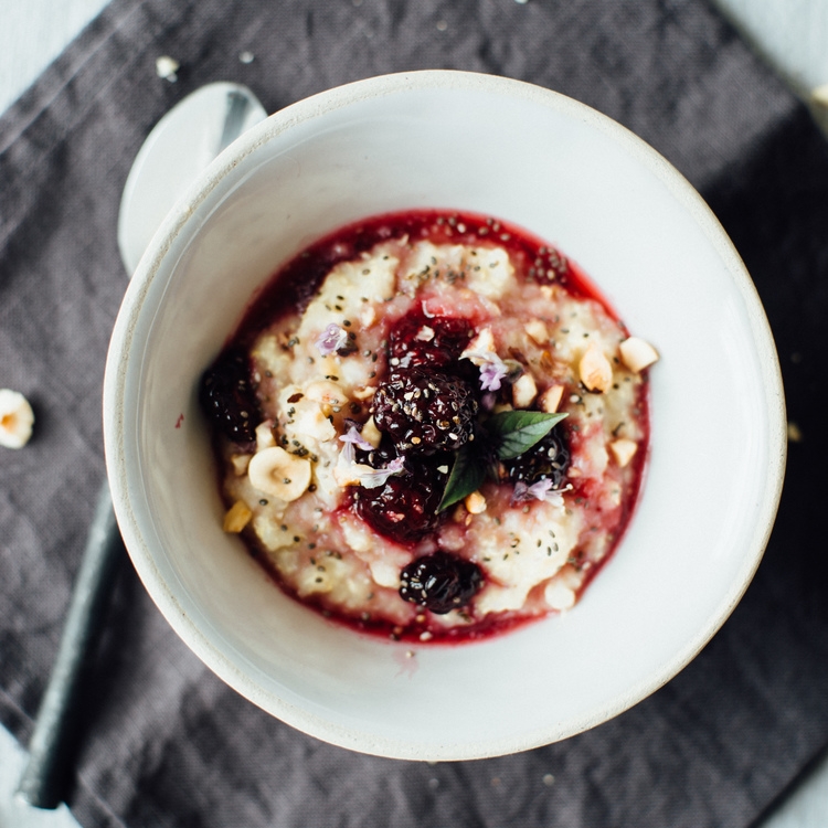 breakfast quinoa flakes w/ stewed blackberries + basil