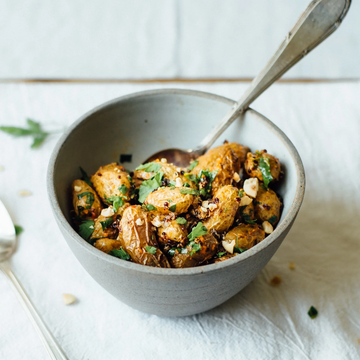 salty smashed potatoes w/ harissa yogurt | v & gf